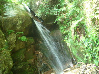 次の案内ポイントの滑り石や梯子谷では、「ここで僧兵が身を隠してたんや、この洞窟とそこらへんで50人は入れるやろ~」「僧兵って何~??」「牛若丸と弁慶の弁慶やなァ」マイナスイオンをたっぷり浴びながら、地元の案内人の比良岡さんと森さんから、まるで日本昔話でも聞くように、歴史的な説明から子どもの頃の生活の様子まで楽しいお話を地元の言葉で聞かせて頂きながら進みます。
